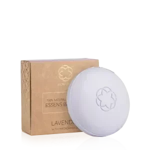 Jabón sólido con aceite esencial 100 % natural de lavanda y aceite de macadamia.